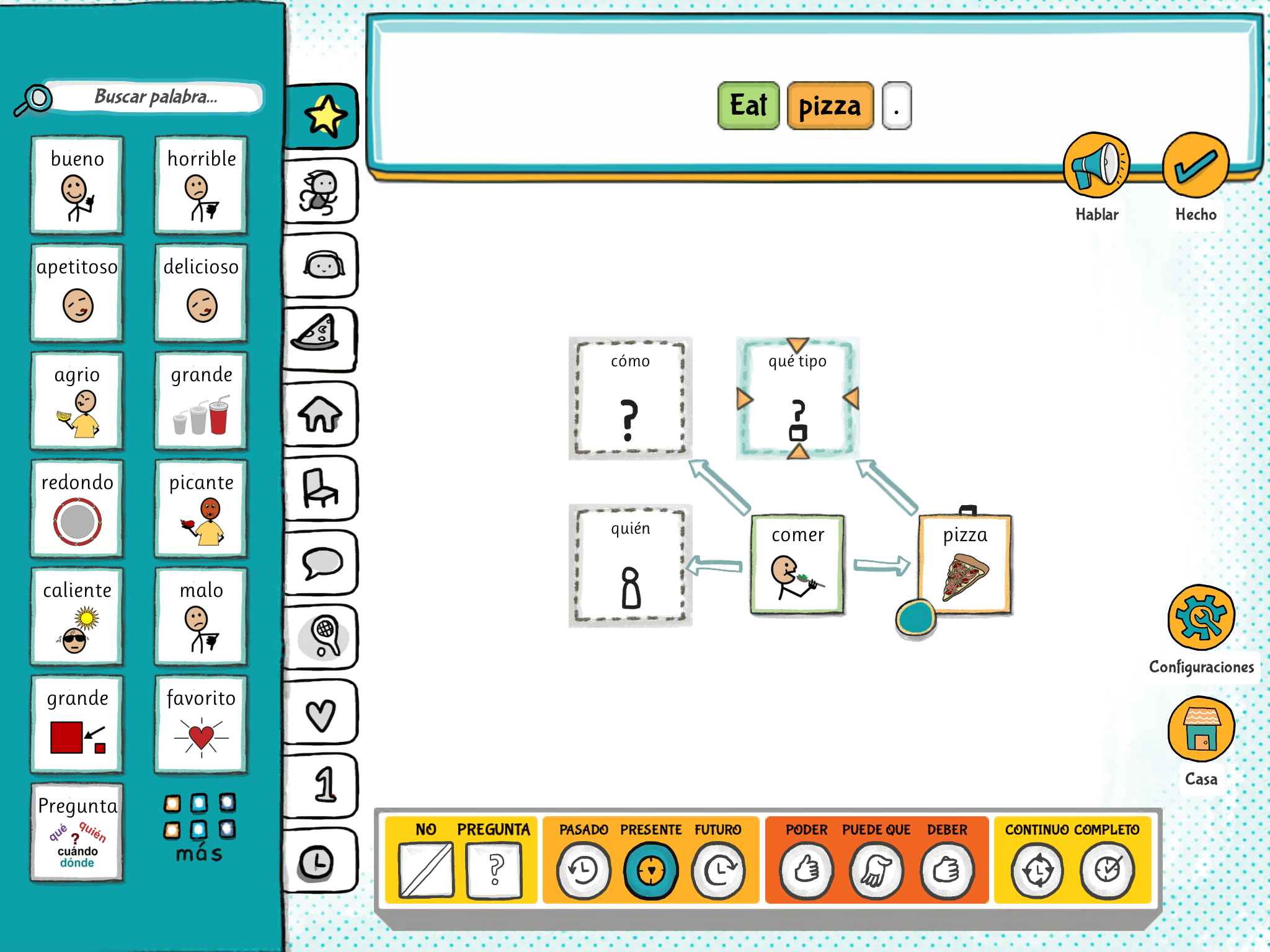 When the learner says, “eat pizza”, Avaz FreeSpeech prompts them to add more details by asking the question “What kind?”